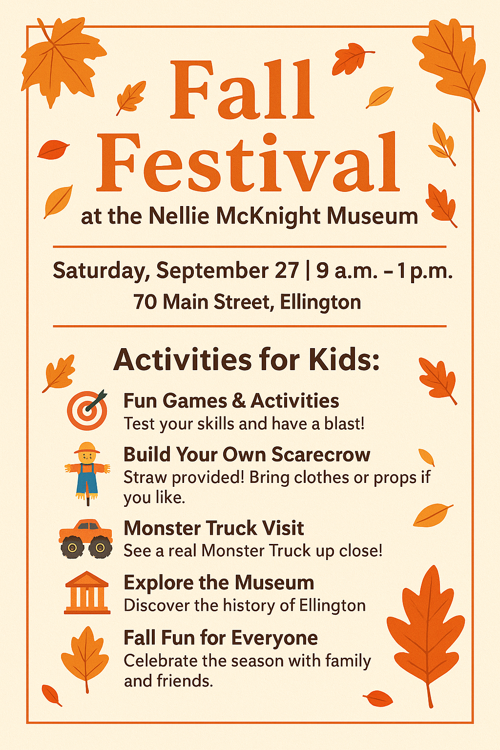 The Ellington Historical Society invites the community to its annual Fall Festival at the Nellie McKnight Museum, 70 Main Street, on Saturday, September 27th. From 9 a.m. to 1 p.m., families can enjoy a variety of free activities, games, and crafts designed for children of all ages. Visitors can build scarecrows with provided straw, participate in seasonal crafts, and explore fun outdoor games. The festival is a wonderful opportunity to celebrate the season, connect with neighbors, and experience the charm of the museum grounds. Admission is free, and everyone is welcome to join in the fall fun!